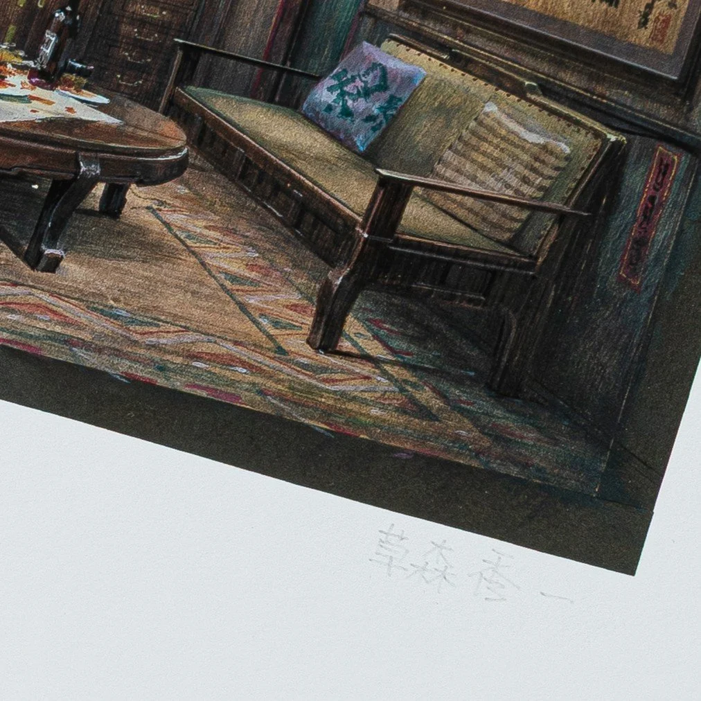 The original artwork consists of two layers, called a “book”. Hiroshi Ohno painted both layers with poster color on paper. The top element was then cut out and mounted on a cel (transparent foil). The independent movement of both layers in front of the animation camera allows to create a parallax effect which simulates a sense of depth in the picture.